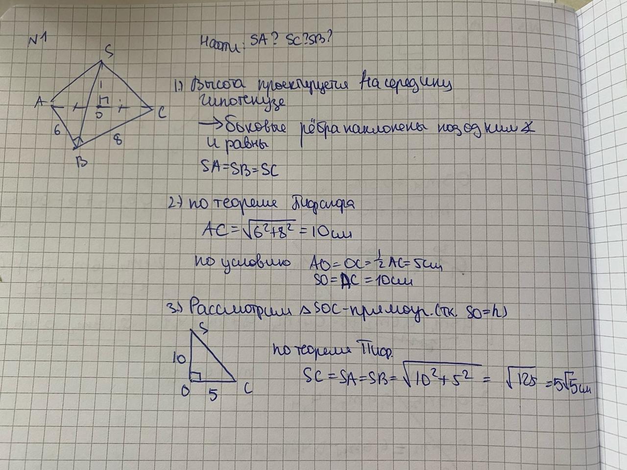 Основание пирамиды — прямоугольный треугольник с катетами 6 и 8 см. Высота пирамиды проходит через середину гипотенузы треугольника и равна гипотенузе. Найдите боковые ребра пирамиды