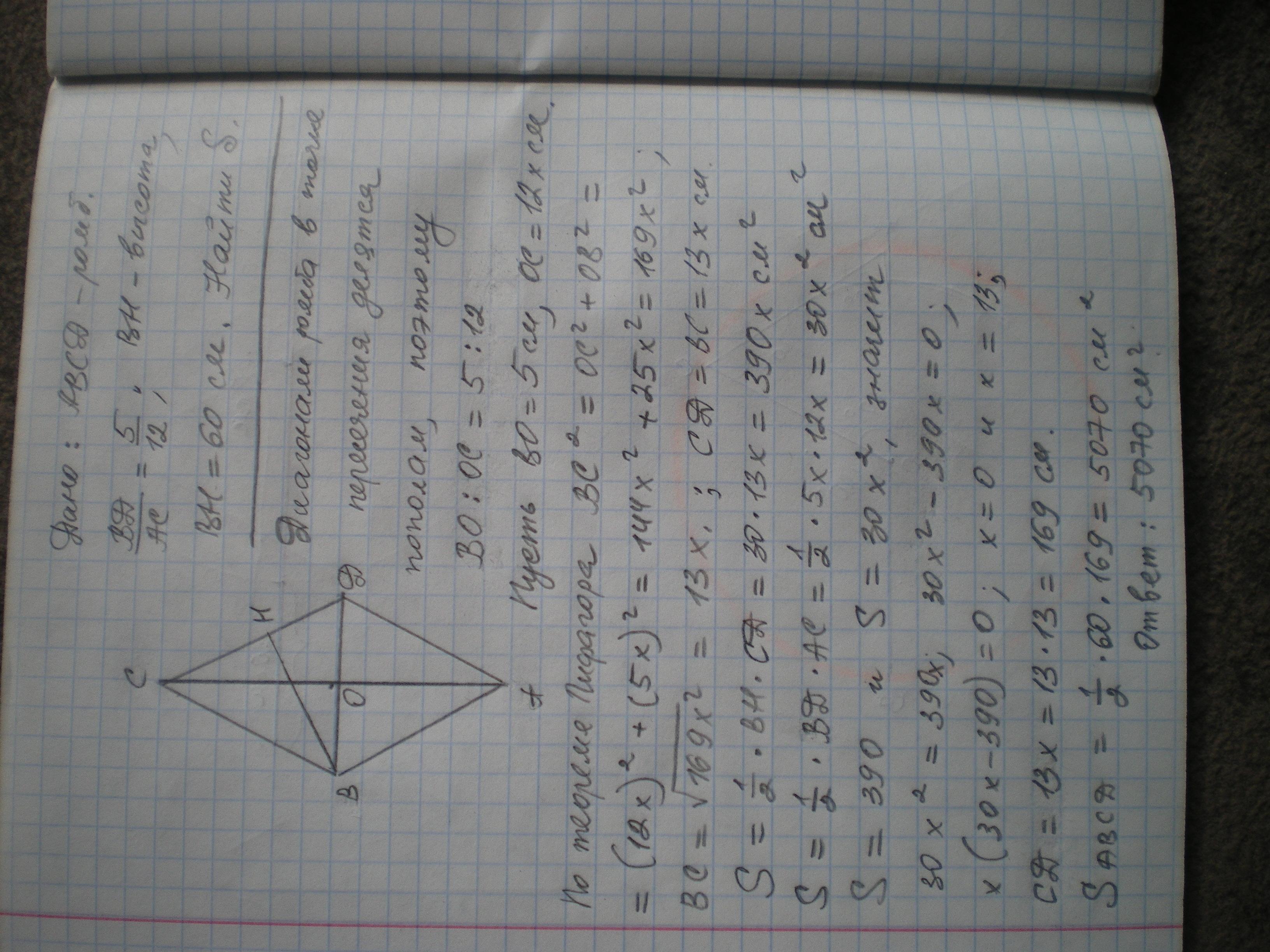 Дано АВСD - ромб, ВН висота, ВН=60 см, ВD/АС=5/12. Знайти S(ABCD).