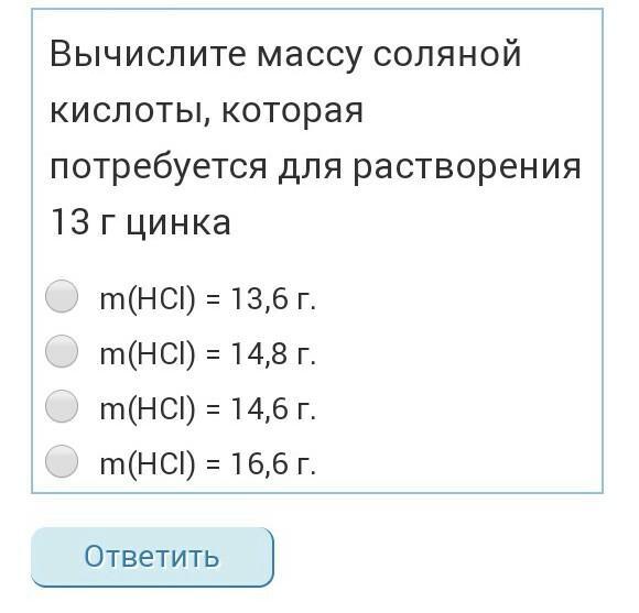 Взаимодействие цинка с соляной кислотой протекает по уравнению: