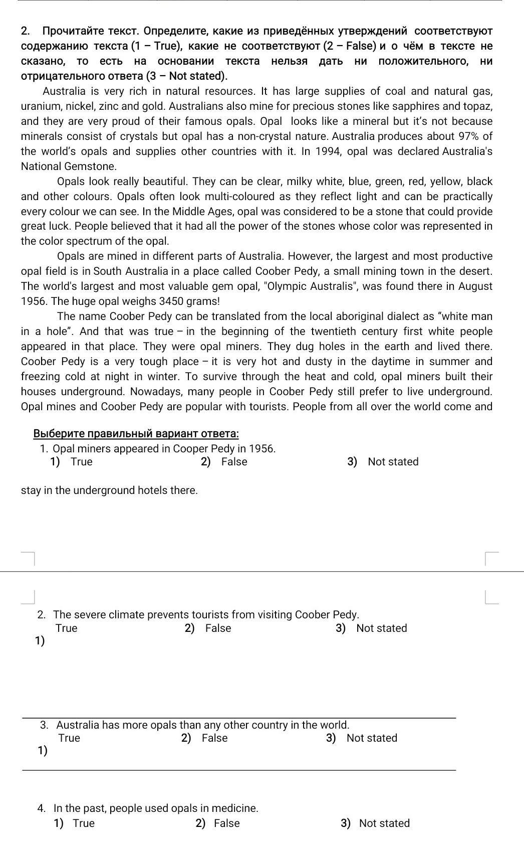 Прочитайте текст. Определите, какие из приведённых утверждений соответствуют содержанию текста (1 – True), какие не соответствуют (2 – False) и о чём в тексте не сказано, то есть на основании текста нельзя дать ни положительного, ни отрицательного ответа (3 – Not stated).