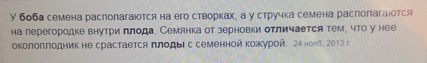 Итог: Стручок, как и боб, имеет две створки, но семена в стручке располагаются не на самих створках, как у боба, а на перегородке внутри плода.