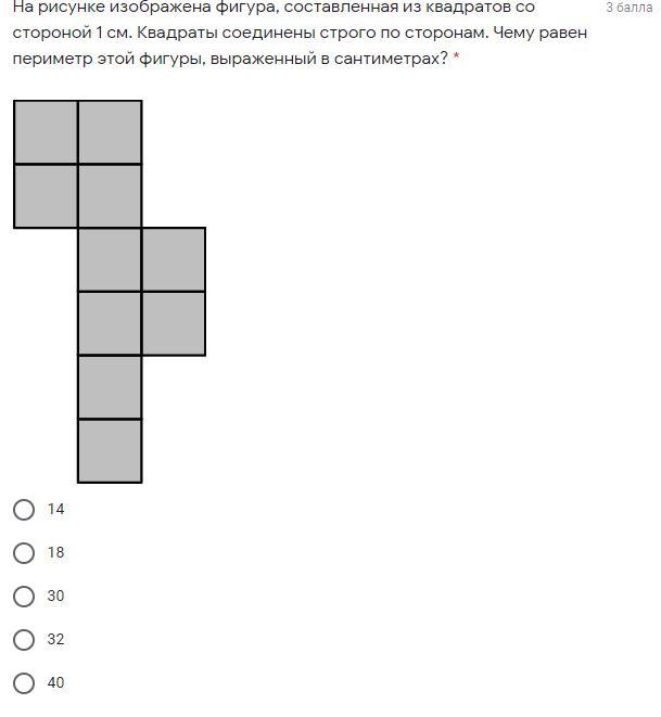 На рисунке изображена фигура, составленная из квадратов со стороной 1 см. Квадраты соединены строго по сторонам. Чему равен периметр этой фигуры, выраженный в сантиметрах?