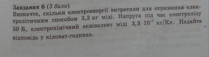 срочнооо!!!!Визначте, скільки електроенергії витратили для отримання електролітичним способом 3,3 кг міді. Напруга під час електролізу 50 В, електрохімічний еквалент міді 3,3•10^-7 кг/Кл. Надайте відповідь у кіловат-годинах