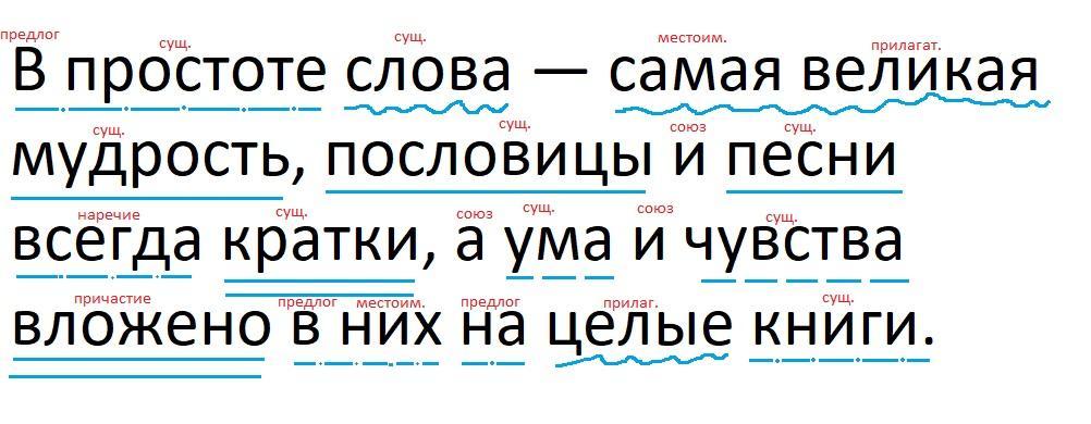 Объяснение: В простоте( дополнение) слова(дополнение) — самая великая (они оба определение)мудрость( подлежащее), пословицы и( союз) песни(оба дополнительные) всегда (обстоятельство)кратки(дополнение), а (союз) ума (дополнение) и чувства (дополнение) вложено(глагол) в них(дополнение)на целые(определение)книги (дополнение)