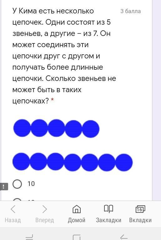 У Кима есть несколько цепочек.Одни состоят из 5 звеньев А другие из 7. Он может соединять эти цепочки с друг другом и получать более длинные цепочки. Сколько звеньев не может быть в таких цепочках?