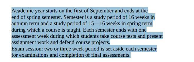 Учебный год начинается первого сентября и заканчивается в конце весеннего семестра. Семестр - это период обучения в 16 недель в осенний семестр и период обучения в 15-16 недель в весенний семестр, в течение которого преподается курс. Каждый семестр заканчивается одной оценочной неделей, в течение которой студенты сдают тестовые задания, представляют задание и защищают курсовые проекты. Экзаменационная сессия: две или три недели отводится каждый семестр для сдачи экзаменов и завершения итоговых оценок.