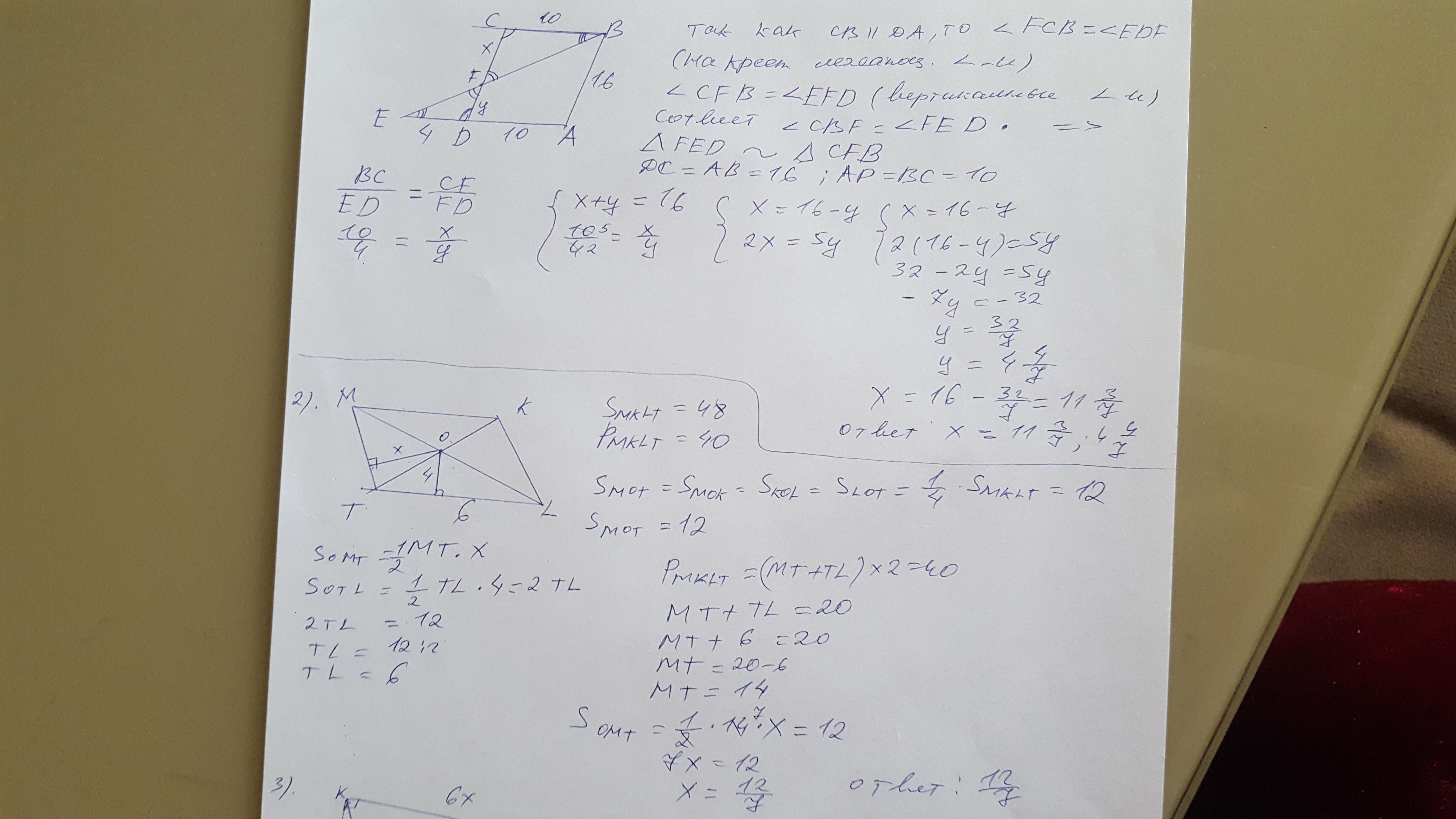 равны вертик-е углы при вершине F, y/x=4/10, y=16-x, (16-x)/x=2/5,