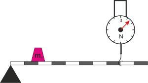 Определи показание динамометра, если рычаг находится в равновесии, а масса противовеса равна m1=14кг.