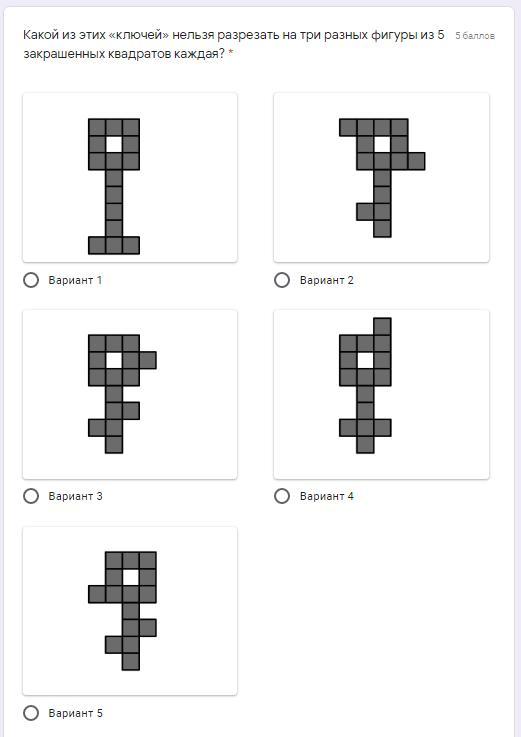 Какой из этих «ключей» нельзя разрезать на три разных фигуры из 5 закрашенных квадратов каждая?
