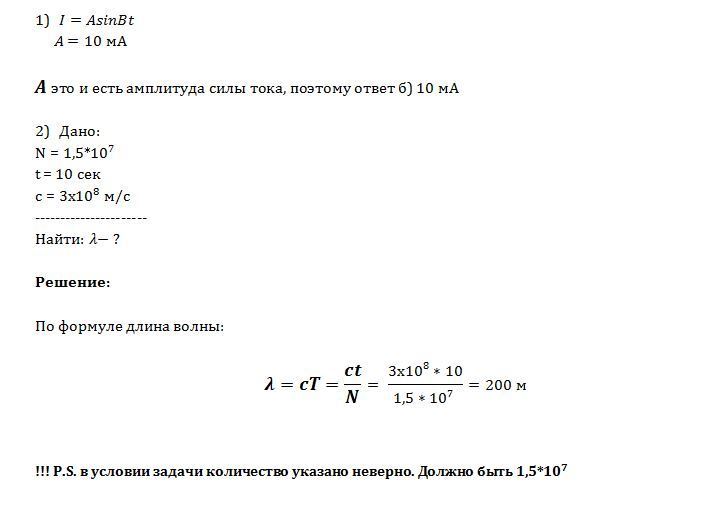 1. Если сила тока в идеальном колебательном контуре изменяется с течением времени по закону I=AsinBt, где А=10 мА, В=20п радс, то амплитудное значение сила тока равно: