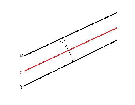 Все точки плоскости, расположенные на одинаковом расстоянии от двух параллельных прямых "а" и "b" , расположены на ПРЯМОЙ "с" , расстояние от которой до прямых "а" и "b" одинаковы и равны ПОЛОВИНЕ расстояния между прямыми "а" и "b" .