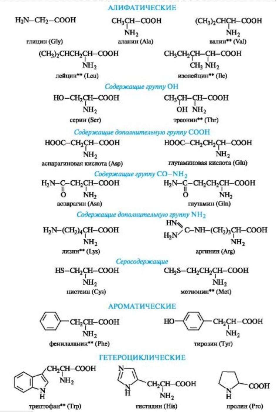 Белковые молекулы - полимерные, неразветвлённые цепи из α-аминокислот. Их около сотни, но 20 из них — важнейшие. (Они есть на скрине)