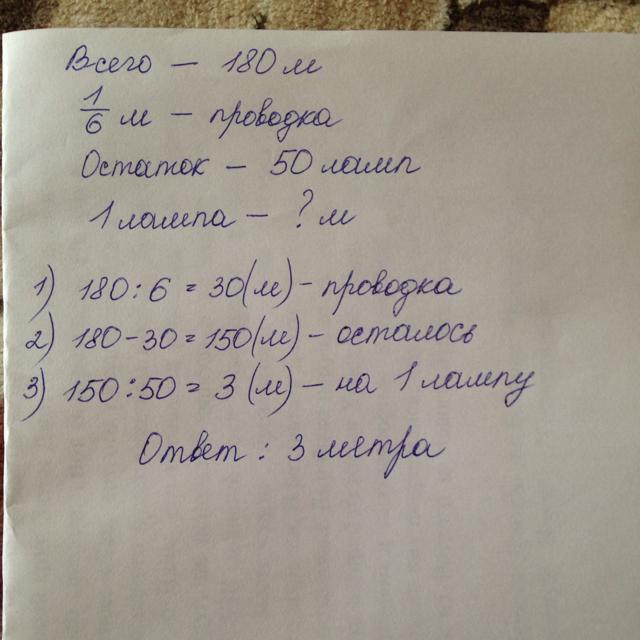 3) 150:50=3(м) -понадобилось на одну настольную лампу.