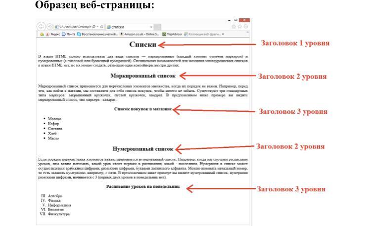 В языке HTML можно использовать два вида списков — маркированные (каждый элемент отмечен маркером) и нумерованные (с числовой или буквенной нумерацией). Специальных возможностей для создания многоуровневых списков в языке HTML нет, но их можно создать, размещая одни контейнеры внутри других.