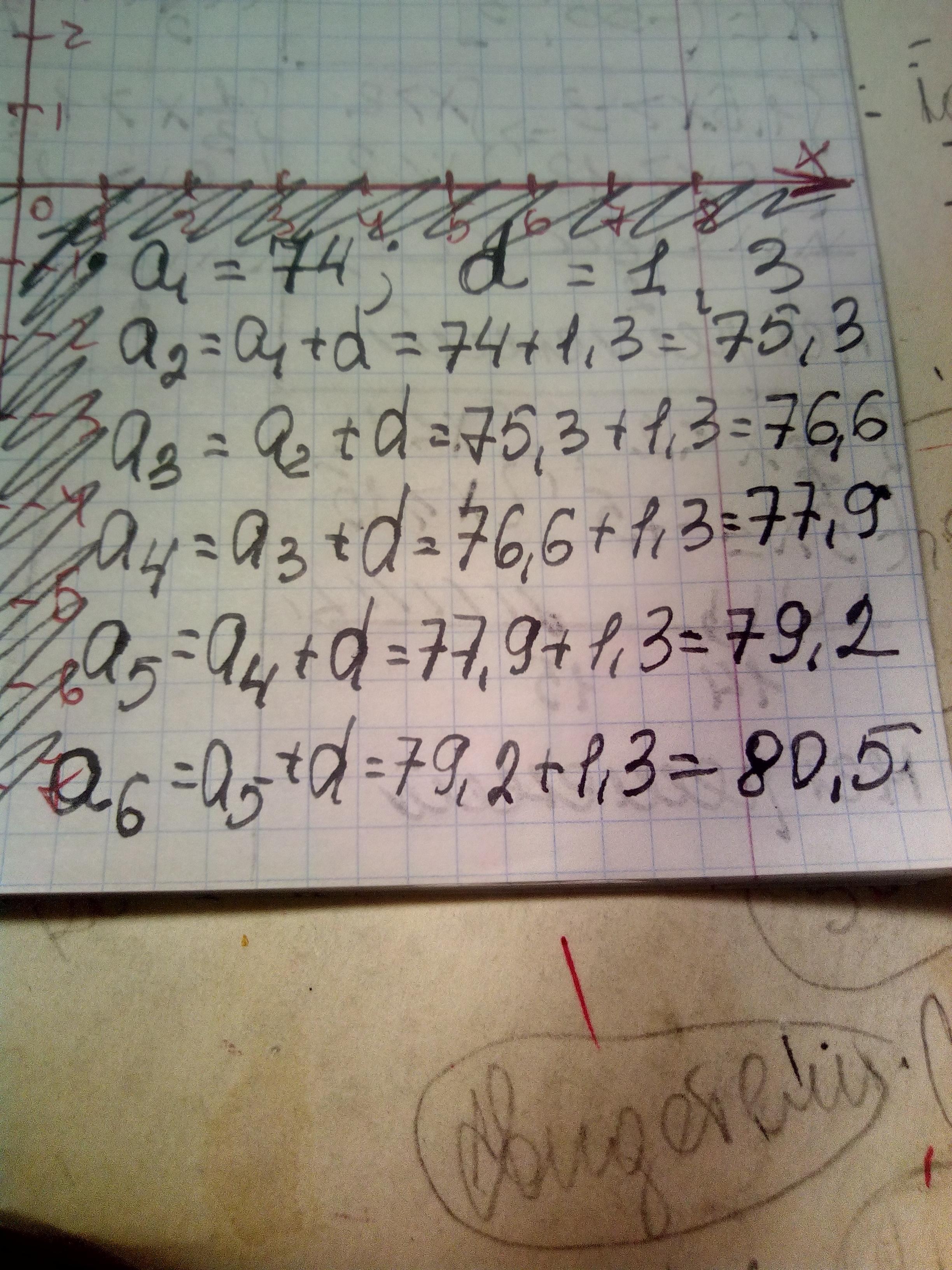 Перший член арифметичної прогресії дорівнює 74, а різниця становить 1,3. Знайти 5 перших членів арифметичної прогресії.
