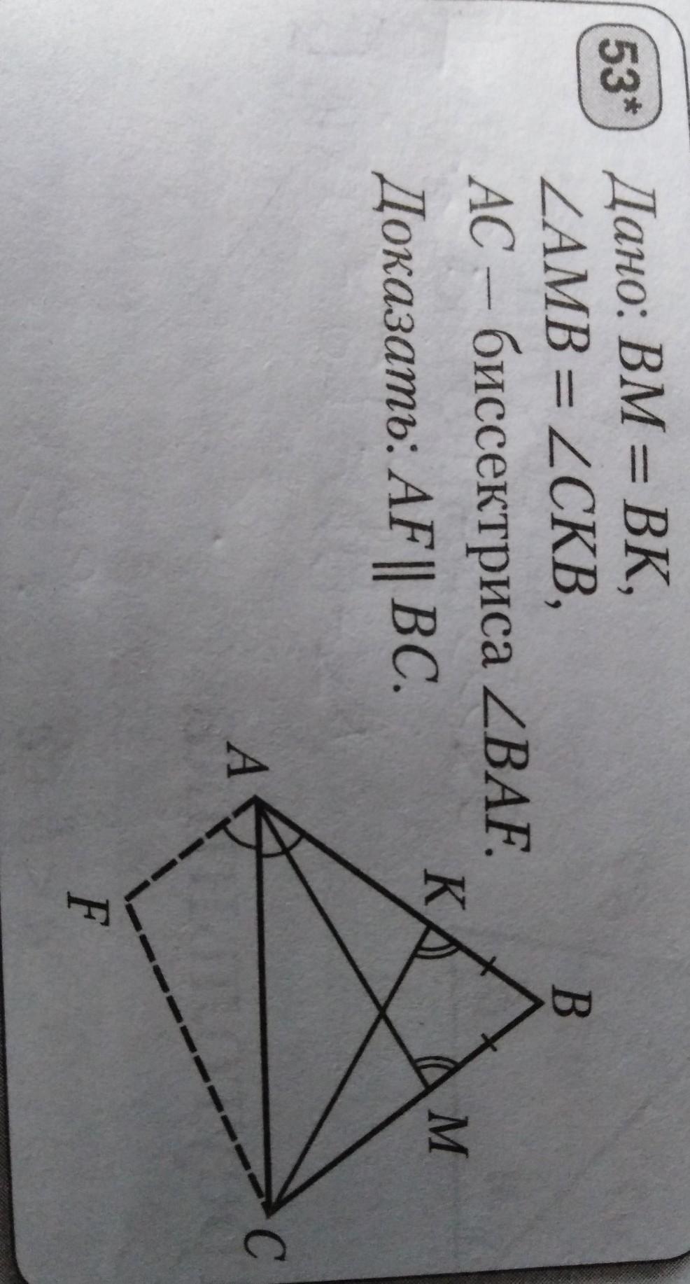 Дано:BM=BK, угол AMB= углу CKB, AC-биссектриса угла BAF. Доказать: AF || BC. ​