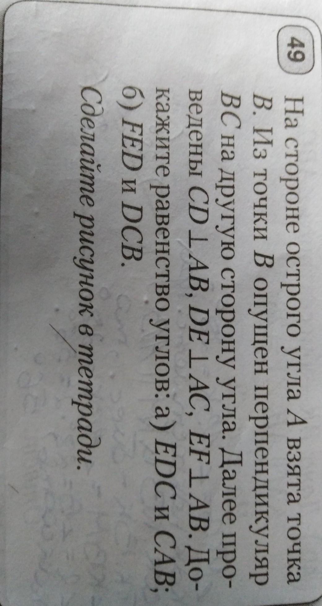 На стороне острого угла A взята точка B. Из точки B отпущен перпендикуляр BC на другую сторону угла. Далее проведены CD перпендикулярно AB, DE ПЕРПЕНДИКУЛЯРНО AC, EF перпендикулярно AB. Докажите равенство углов:а) EDC и CAB ;б)FED и DCB. Сделайте рисунок