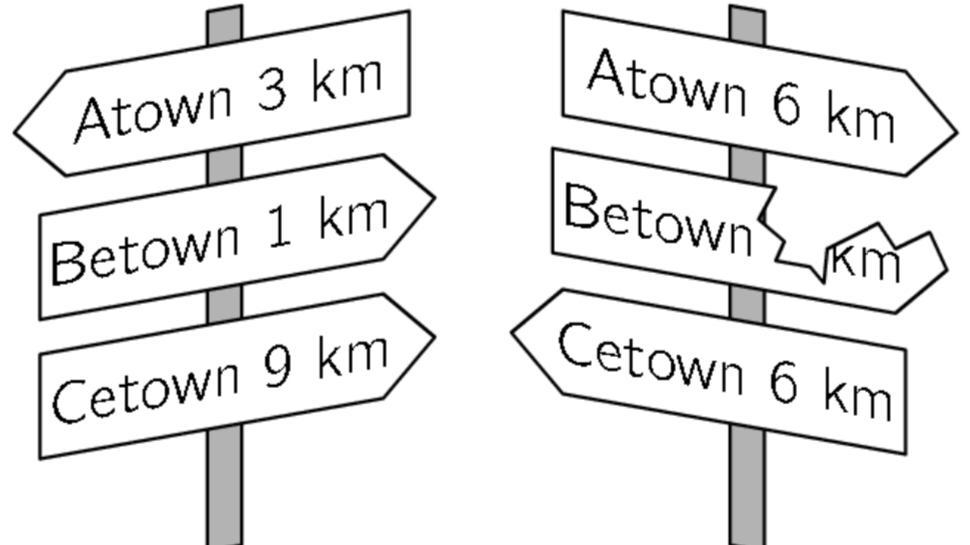 было написано на сломанном указателе? Подписи на указателях. На левом: Город А – 3 км Город В – 1 км Город С – 9 км На правом: Город А – 6 км Город В – км Город С – 6 км. Варианты ответов: 1км; 2км; 3км; 4 км;5км