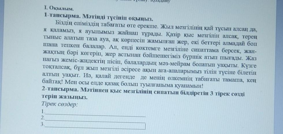 Очень срочно! Нужна помощь! Прочитайте тест ( 1 тапсырма) по тексту во 2 тапсырма надо выписать 3 ключевых СЛОВА про зиму!!!!!!