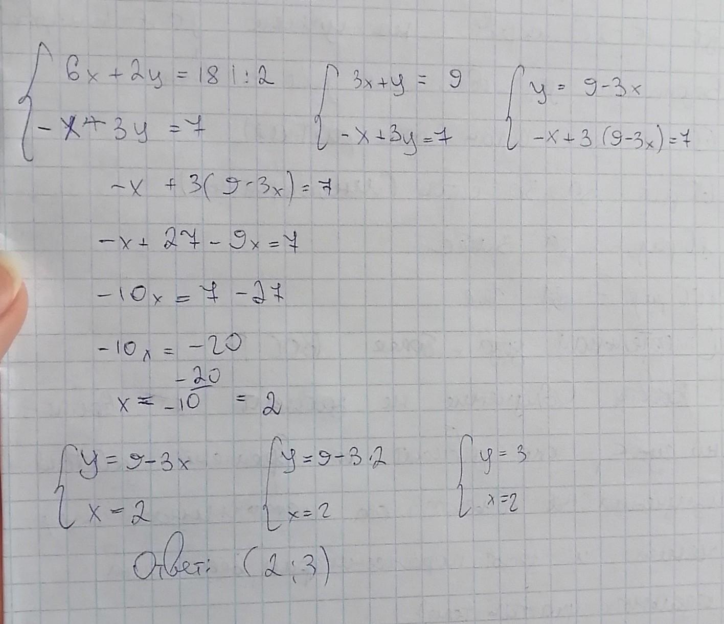 какие из пары чисел (-2,-3),(2,3),(-2;3),(2;-3),(2;2) является решением уравнений:6х+2y=18и-x+3y=7