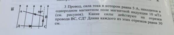 СРОЧНО!!! ПОЖАЛУЙСТА!!Провод,сила тока в котором равна 5 А, находится в однородном магнитом поле магнитной индукции 10мТл.Какие силы действуют на отрезки провода ВС,СД? Длина каждого из этих отрезков равна 30 см.