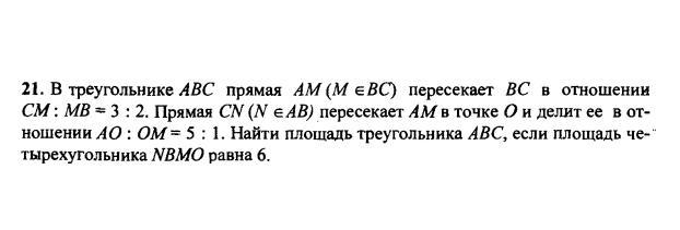 В треугольника ABC прямая AM (M принадлежит BC) пресекает BC в отношении CM:MB=3:2. Прямая CN (N принадлежит AB) пересекает AM в точке O и делит ее в отношении AO:OM=5:1. Найти площадь треугольника ABC, если площадь четырехугольника NBMO равна 6.