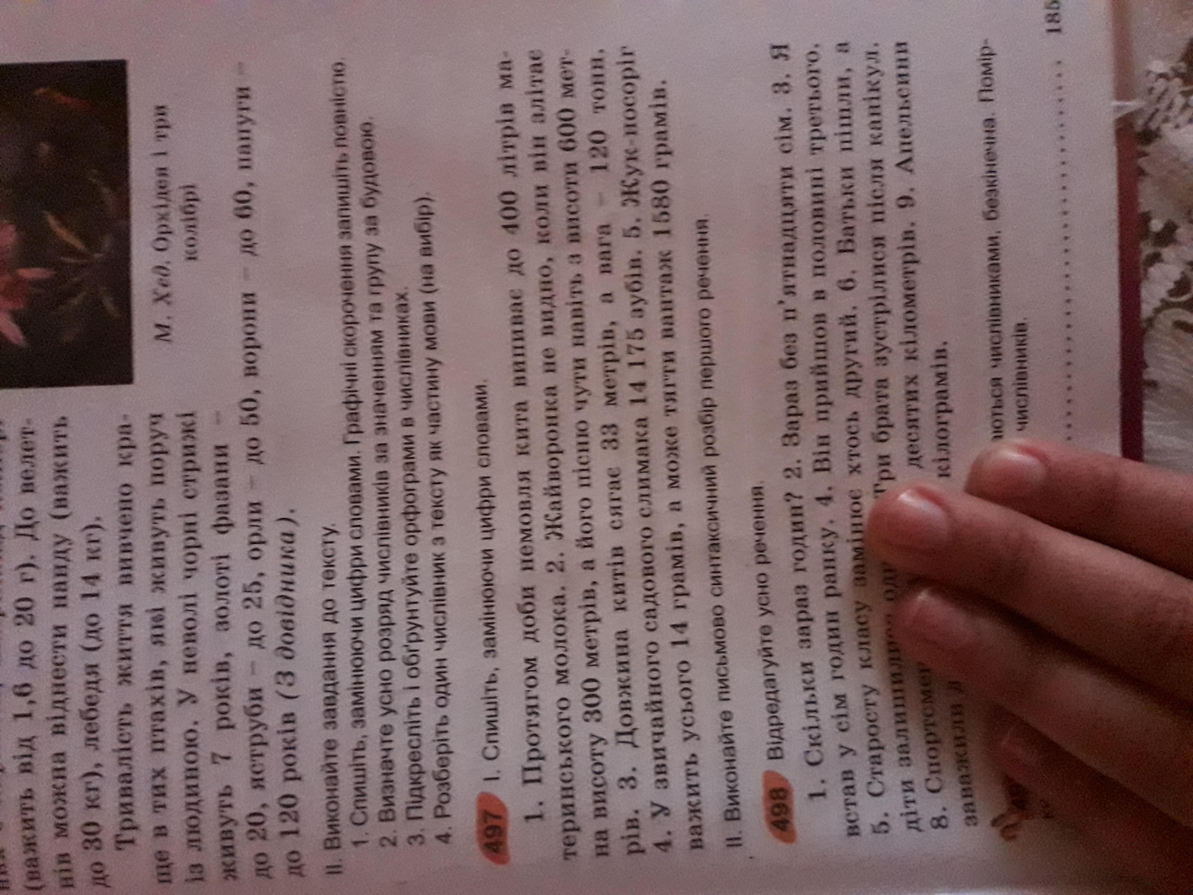 Якщо вправа 497, то: 1. (...до чотириста літрів...) 2.(...висоту триста метрів...), (... з висоти шістсот метрів... ) 3. (...сягає тридцять три метрів...), (... а вага - сто двадцять тонн...). 4. (...слимака чотирнадцять тисяч сто сімдесят п'ять зубів...). 5. (...усього чотирнадцять грамів...), (...вантаж одна тисяча п'ятсот вісімдесят грамів.)