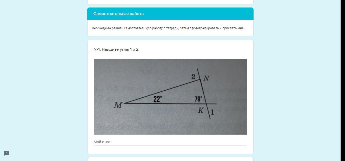 Объяснение: угол 1= углу МКN=79° они вертикальные, угол MNK=180-79-22=77° , угол 2=180-угол MNK=103° , они смежные. 2: угол1=углуMKN=82° , вертикальные; уголMNK=180-82-16=82° , угол2=180- угол МNK=98° ,они смежные