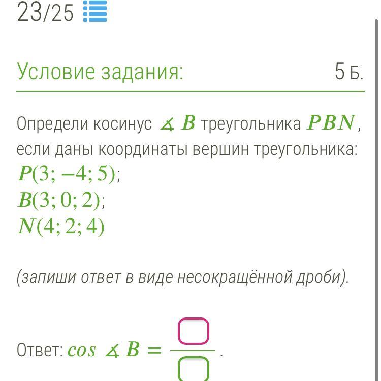Определи косинус В треугольника РВN если даны координаты вершин треугольника Р(3;-4;5)