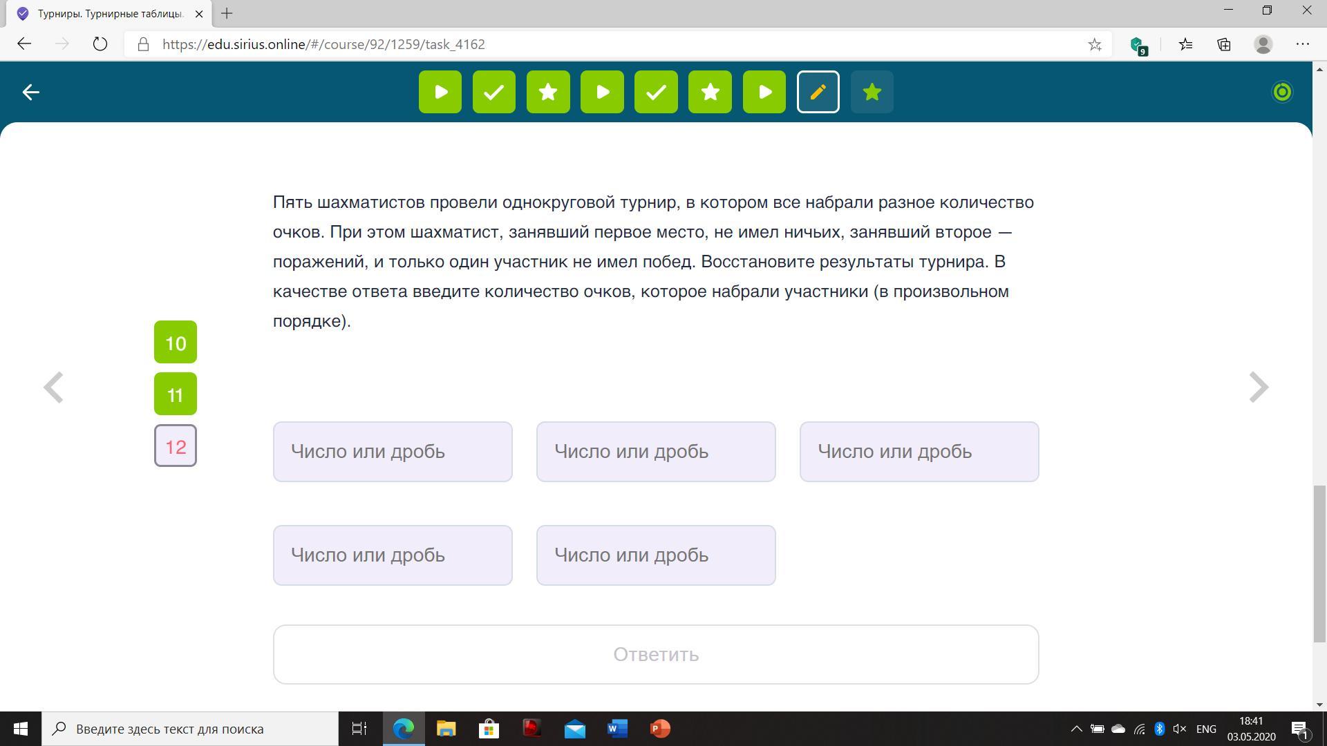 Пять шахматистов провели однокруговой турнир, в котором все набрали разное количество очков. При этом шахматист, занявший первое место, не имел ничьих, занявший второе — поражений, и только один участник не имел побед. Восстановите результаты турнира. В качестве ответа введите количество очков, которое набрали участники (в произвольном порядке).