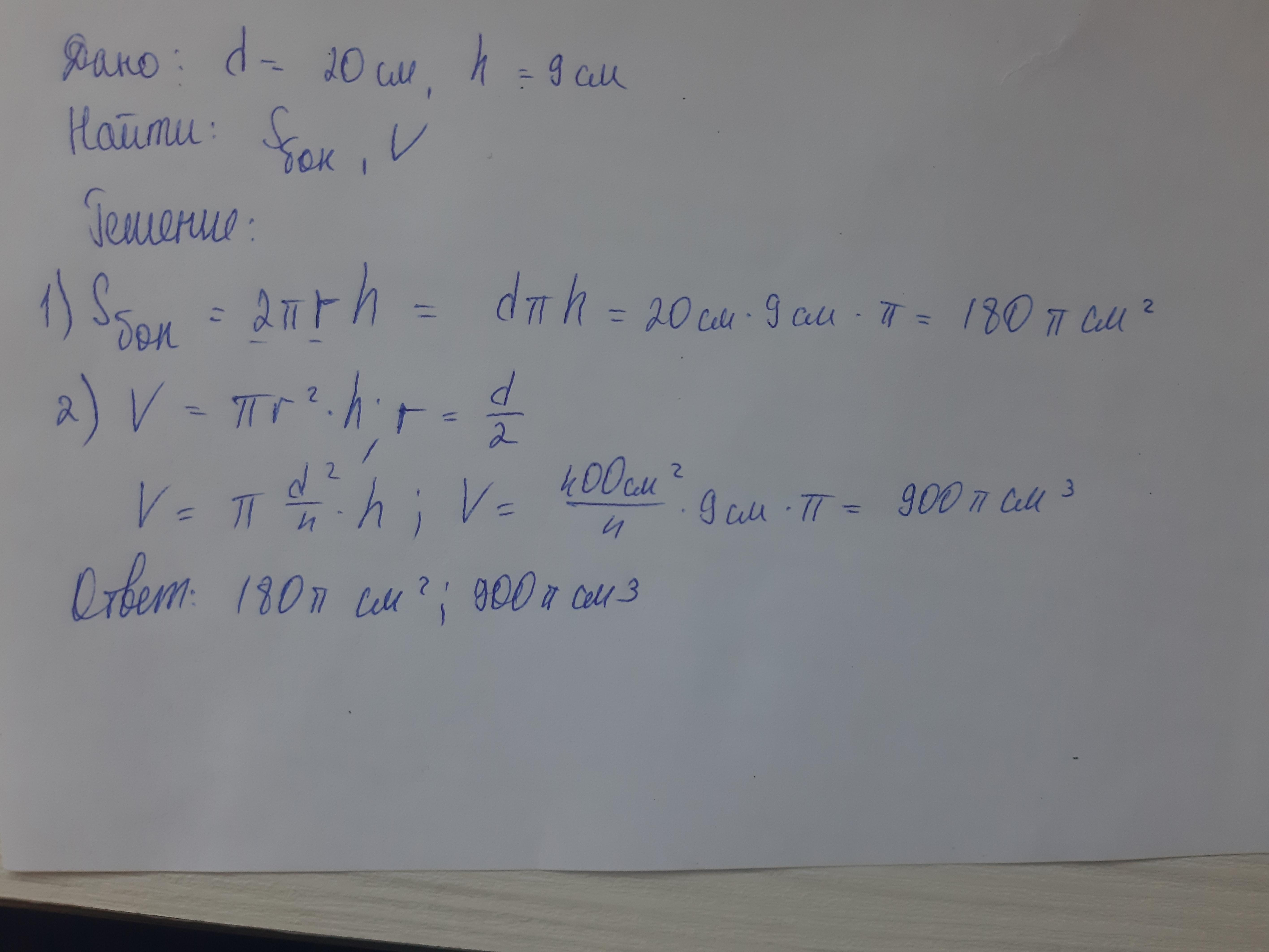 Диаметр основания цилиндра 20 см, а длина 9 см. Определите площадь боковой поверхности и обьем цилиндра