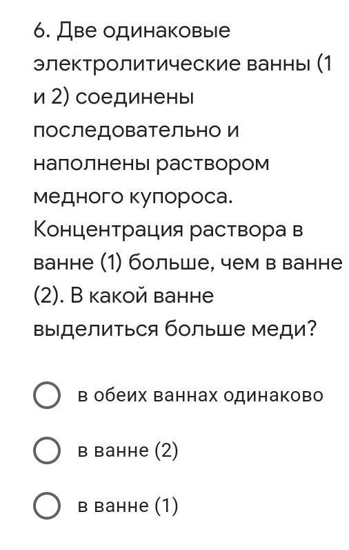 Две одинаковые электролитические ванны (1 и 2) соединены последовательно и наполнены раствором медного купороса. Концентрация раствора в ванне (1) больше, чем в ванне (2). В какой ванне выделиться больше меди?