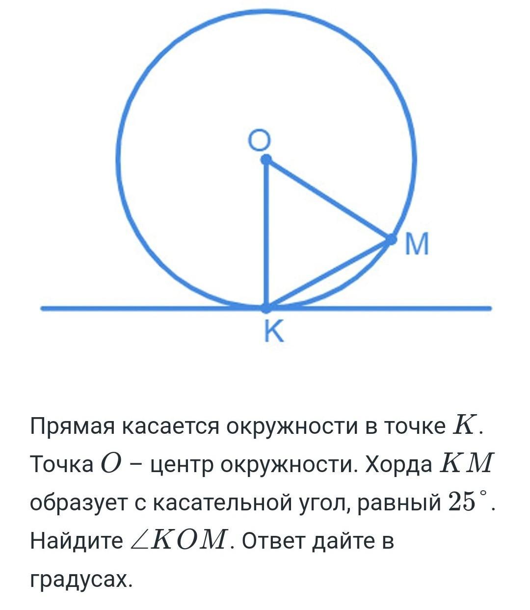 ОК=ОМ, т.к это радиусы, значит треугольник ОМК равнобедренный, значит <ОМК=65