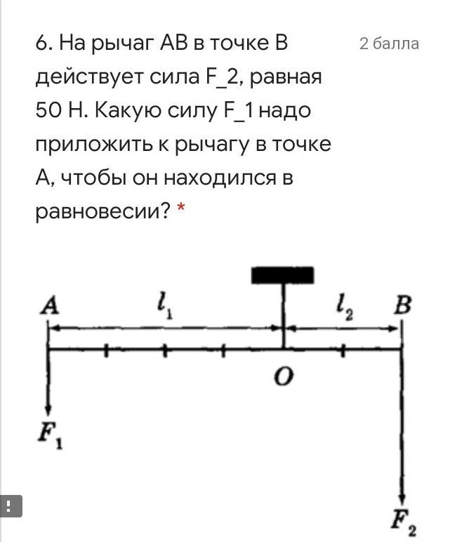 на рычаг АВ в точке В действует сила F2, равная 50 Н. Какую силу F1 надо приложить к рычагу в точке А, чтобы он находился в равновесии?