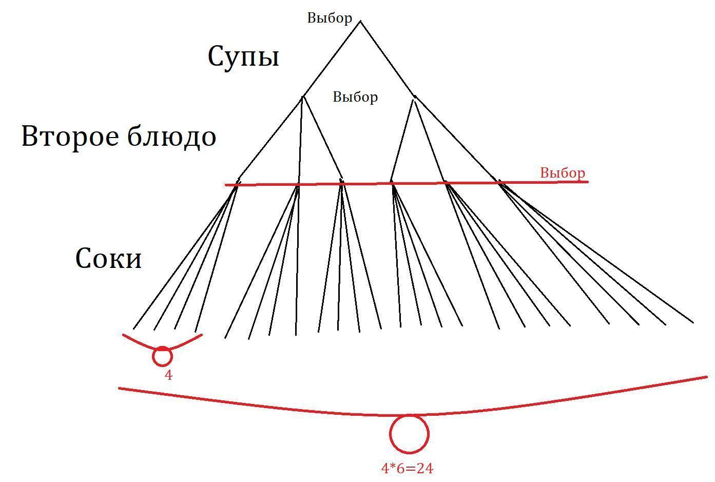 На обед в школьной столовой предлагается 2 супа,3 вторых и 4 разных сока.Сколько различных обедов можно составить из трех блюд можно составить по предложенному меню?постройте дерево всех возможных вариантов(если можете скиньте пожалуйста само дерево)