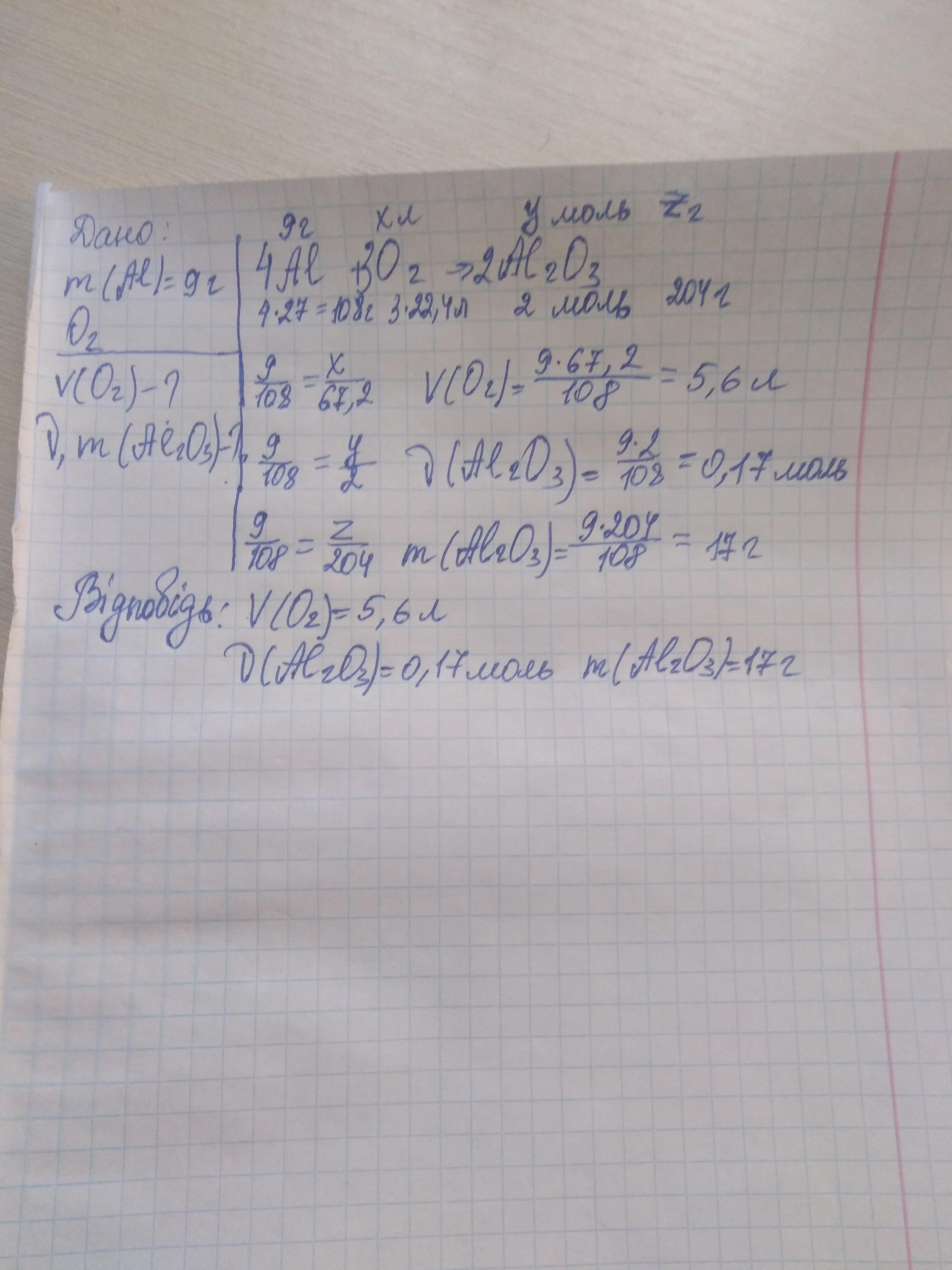 алюміній масою 9г сполучили з киснем. який об'єм кисню витратився? яка маса та кількість речовини алюміній оксиду утворився?