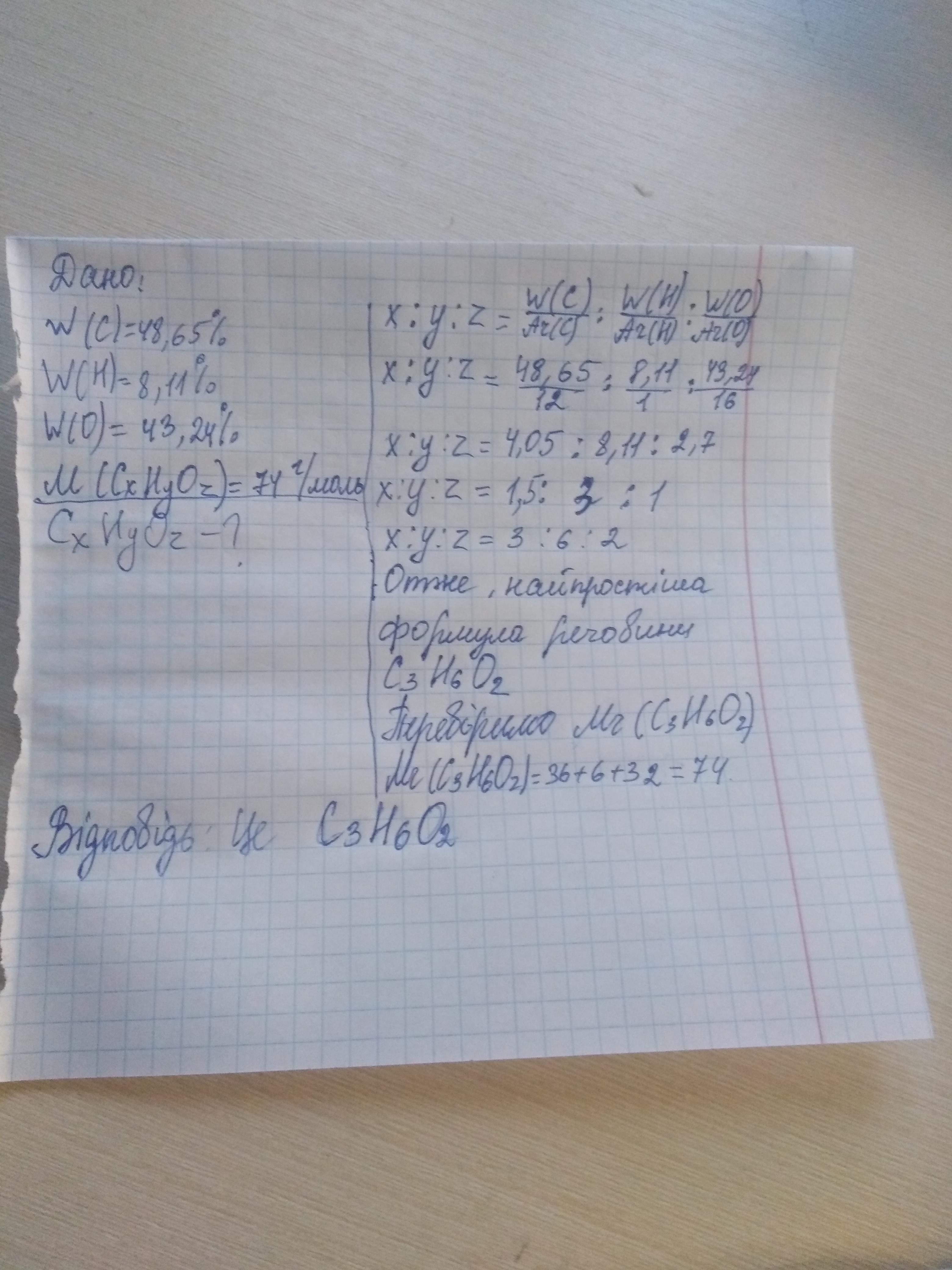 Масові частки елементів в органічній речовині становлять: Карбону – 48,65%, Гідрогену – 8,11%, Оксигену – 43,24%. Визначте формулу речовини, якщо її молярна маса дорівнює 74 г/моль. У відповіді вкажіть суму атомів в одній молекулі цієї речовини.