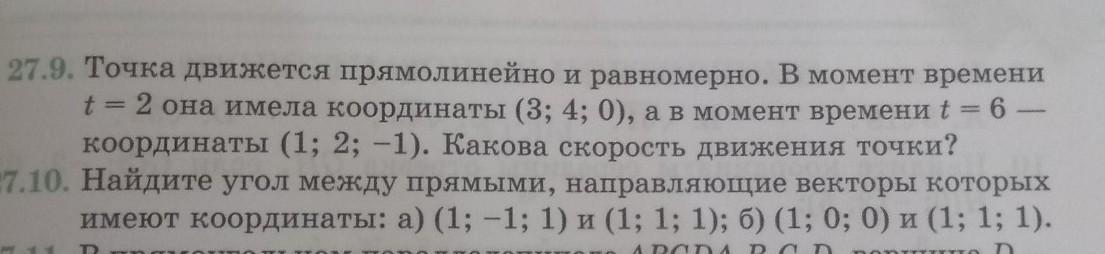 Точка движется прямолинейно и равномерно. В момент времени t=2 она имела координаты (3;4;0), а в момент времени t=6 – координаты (1;2;-1). Какова скорость движения точки?