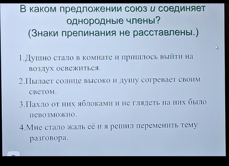 В каком предложении союз и соединяет однородные члены? Это предложение номер 2: в нём союз и соединяет однородные сказуемые пылает, согревает
