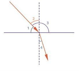 На рисунке показан световой луч, падающий на границу раздела двух сред. Угол падения — это угол: