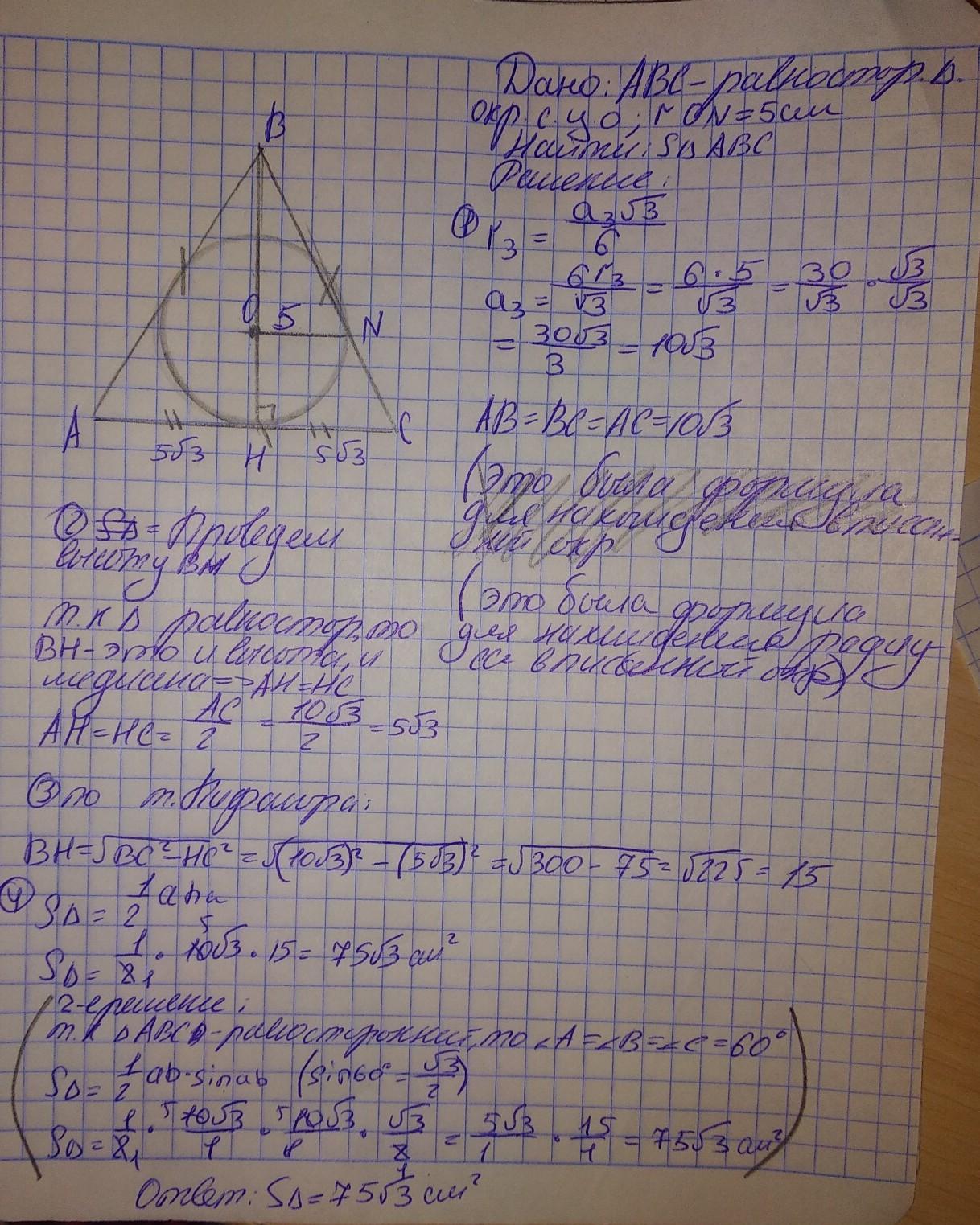 Даю 40 балов. в равносторонний треугольник вписана окружность радиуса 5 см. найдите площадь треугольника.дайте открытый ответ, с разъяснениями
