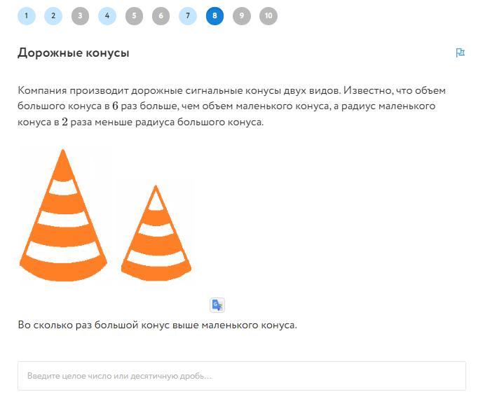 Компания производит дорожные сигнальные конусы двух видов. Известно, что объем большого конуса в 6 раз больше, чем объем маленького конуса, а радиус маленького конуса в 2 раза меньше радиуса большого конуса.