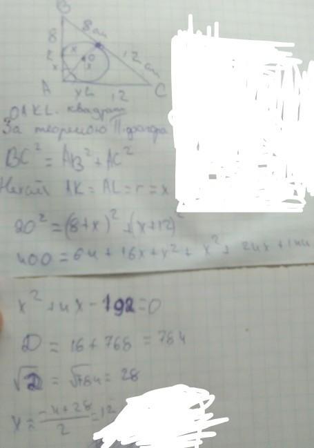Точка дотику вписаного у прямокутний трикутник кола поділяє гіпотенузу на відрізки 8 см і 12 см . Обчислити радіус вписаного кола