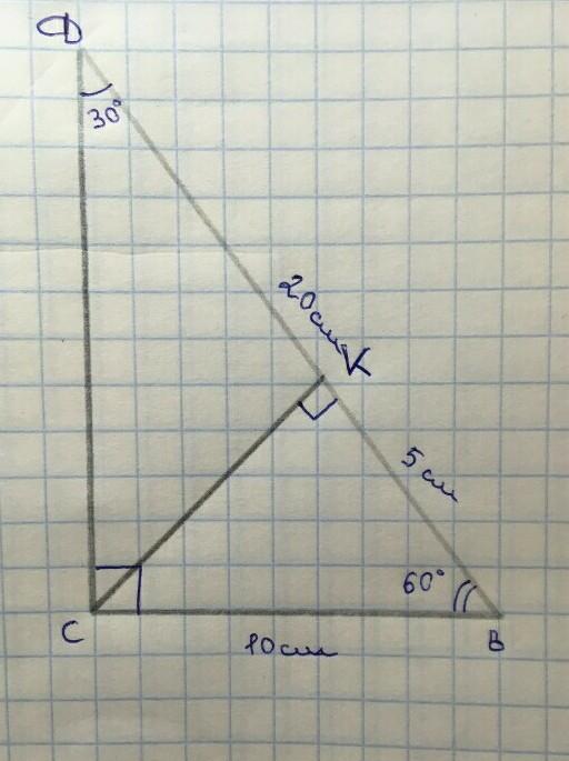 У прямокутному трикутнику DBC(кут С=90 градусів) провели висоту СК. Знайдіть відрізок BK якщо DB=20см, ВС=10см