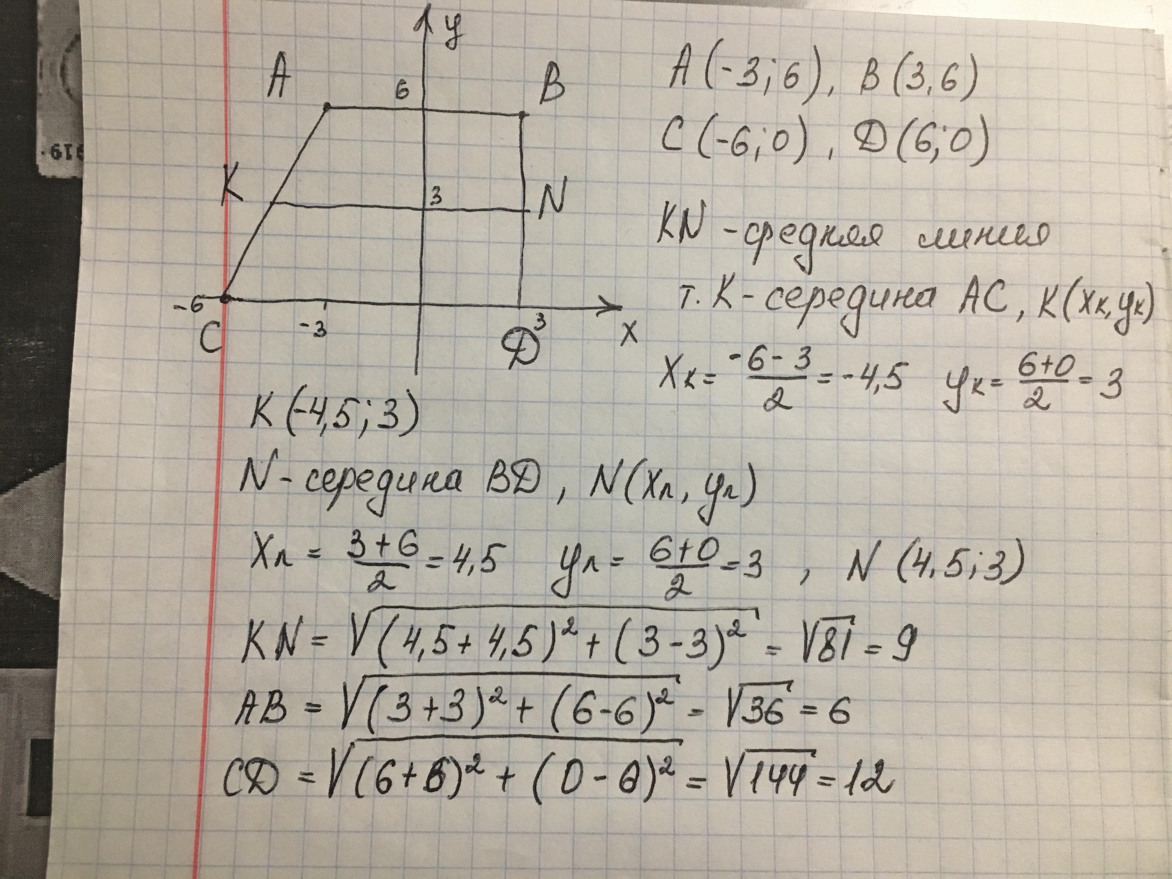 Точки А(- 3;6), В(3;6), С(- 6;0), D(6;0) – вершины прямоугольной трапеции с основаниями АВ и CD. Найдите длину средней линии, длины оснований.