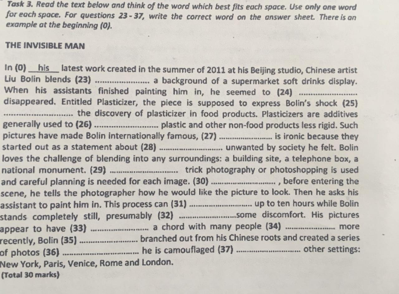 - Task 3. Read the text below and think of the word which best fits each space. Use only one word for each space. For questions 23 - 37, write the correct word on the answer sheet. There is an example at the beginning (0). THE INVISIBLE MAN In (O) his latest work created in the summer of 2011 at his Beijing studio, Chinese artist Liu Bolin blends (23) into a background of a supermarket soft drinks display. When his assistants finished painting him in, he seemed to (24) have disappeared. Entitled Plasticizer, the piece is supposed to express Bolin's shock (25) at the discovery of plasticizer in food products. Plasticizers are additives generally used to (26) make plastic and other non-food products less rigid. Such pictures have made Bolin internationally famous, (27) which is ironic because they started out as a statement about (28) feeling unwanted by society he felt. Bolin loves the challenge of blending into any surroundings: a building site, a telephone box, a national monument. (29) This trick photography or photoshopping is used and careful planning is needed for each image. (30) So, before entering the scene, he tells the photographer how he would like the picture to look. Then he asks his assistant to paint him in. This process can (31) last up to ten hours while Bolin stands completely still, presumably (32) feeling some discomfort. His pictures appear to have (33) striken a chord with many people (34) and more recently, Bolin (35) has branched out from his Chinese roots and created a series of photos (36) where he is camouflaged (37) into other settings: New York, Paris, Venice, Rome and London.