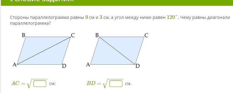 Стороны параллелограмма равны 9 см и 3 см, а угол между ними равен 120°. Чему равны диагонали параллелограмма? даю 20 баллов