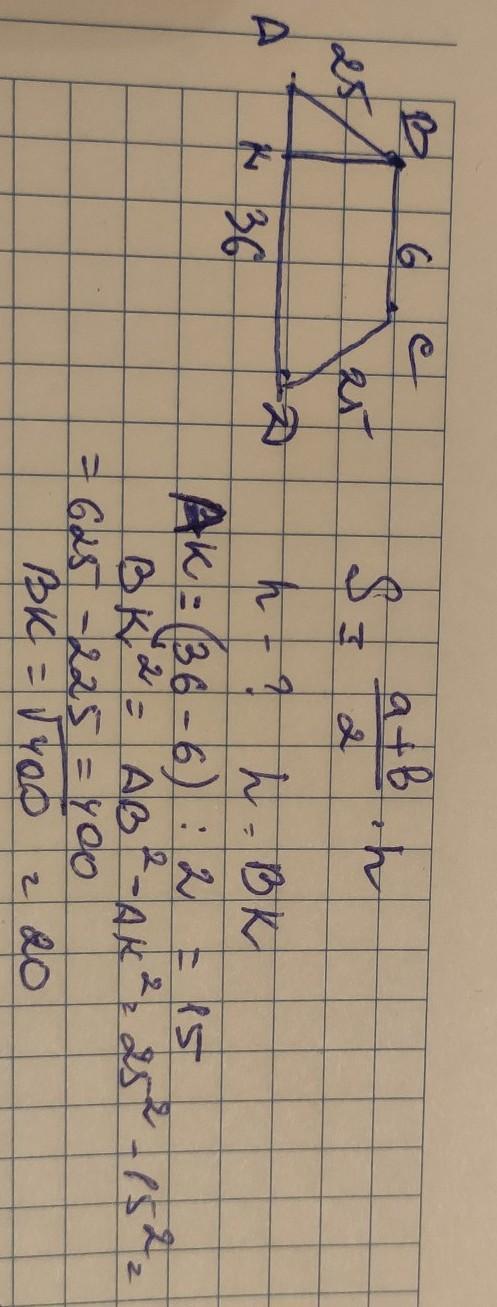 У рівнобічної трапеції основи дорівнюють 6см і 36 см, бічна сторона 25 см . Знайдіть площу трапеції