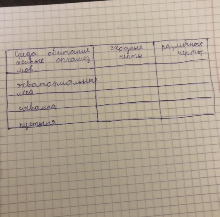 Определите сходные и различные черты среды обитания живых организмов влажных экваториальных лесов, саванн и пустынь.сделать по таблице