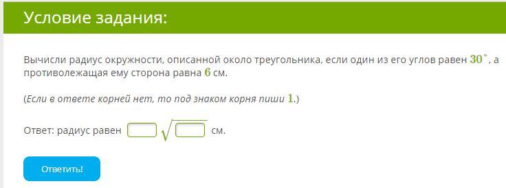 Вычисли радиус окружности, описанной около треугольника, если один из его углов равен 30°, а противолежащая ему сторона равна 6 см.